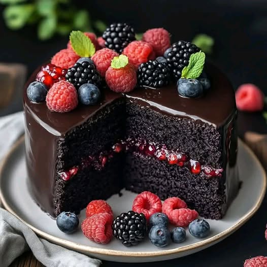 Dark, rich, and irresistibly smooth β this Black Velvet Berry Cake combines layers of moist dark chocolate cake with a silky berry cream frosting and bursts of fresh berries. A true showstopper dessert! β¨