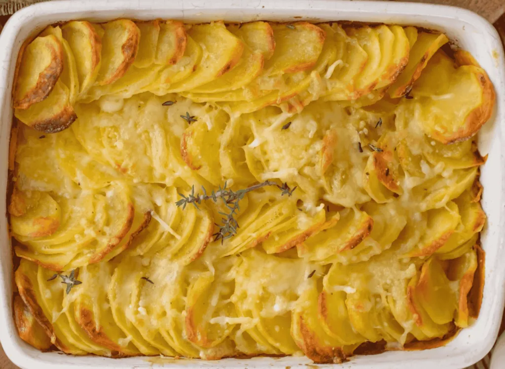 Ingredients: 4 large potatoes, thinly sliced 1 cup heavy cream 1/2 cup milk 1 cup grated cheese (Gruyère or Cheddar) 2 cloves garlic, minced Salt and pepper to taste Butter for greasing the baking dish Steps: read more on the next page
