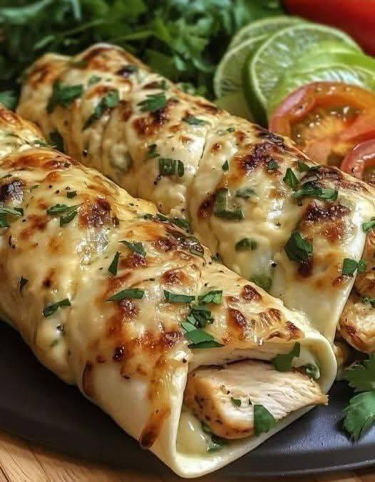 Ingredients: 2 cups cooked chicken (shredded or diced) 1 cup shredded mozzarella cheese 1/2 cup cream cheese (softened) 2 cloves garlic (minced) 1 tsp Italian seasoning Salt and pepper to taste 4 large flour tortillas 1 cup fresh spinach or lettuce (optional) Olive oil (for cooking) way to cook:   read more on next page:
