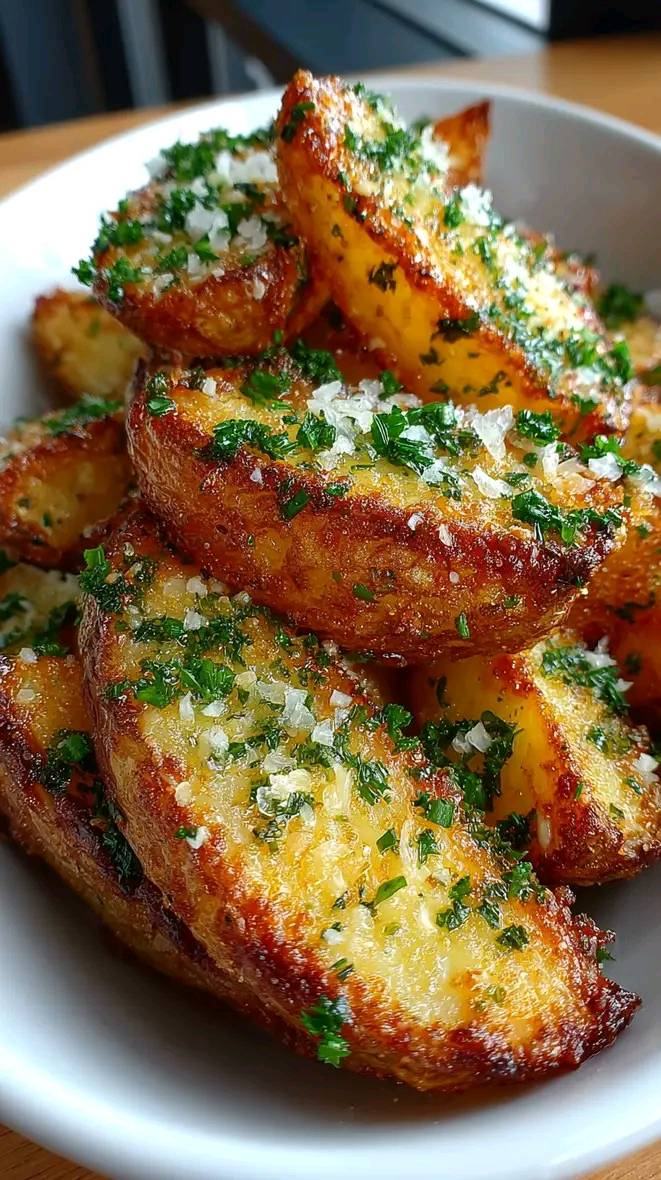 🛒 Ingredients: 4 large russet potatoes, cut into wedges 3 tbsp olive oil 3 cloves garlic, minced 1/2 cup grated Parmesan cheese 1 tsp Italian seasoning 1/2 tsp paprika Salt & pepper to taste Fresh parsley for garnish (optional) 👩‍🍳 Directions: see continuation on next page